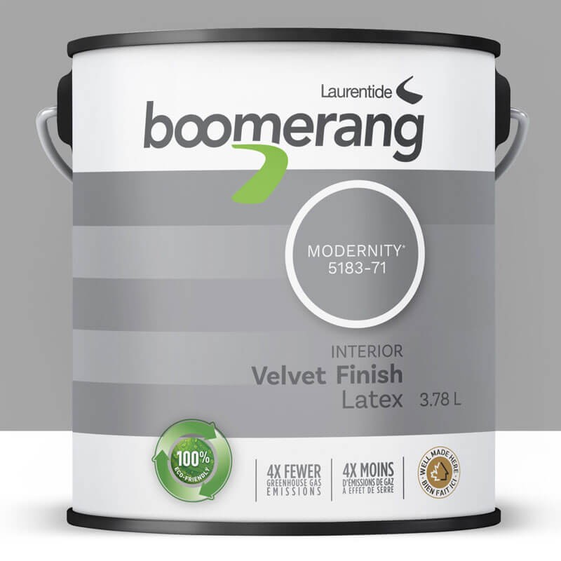 Peinture au latex de première qualité, elle s’utilise à l’intérieur. La peinture 100 % Écoresponsable Boomerang est une peinture écologique certifiée fabriquée par Société Laurentide, une entreprise 100 % québécoise fière et engagée dans le développement durable et sa communauté.